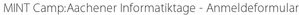 Auf dieser Webseite kannst Du Dich verbindlich zum MINT Camp: Aachener Informatiktage 2014, veranstaltet durch die Fachgruppe Informatik der RWTH Aachen University und den MINT EC Verein, anmelden.