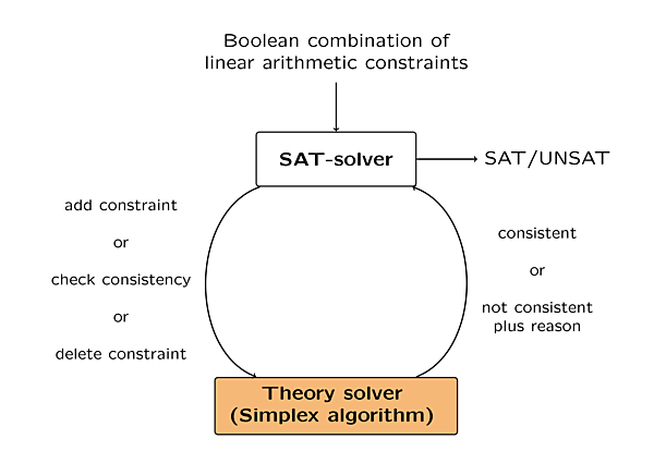 An SMT-solver is usually composed of a SAT-solver and a theory solver as illustrated by the following figure: